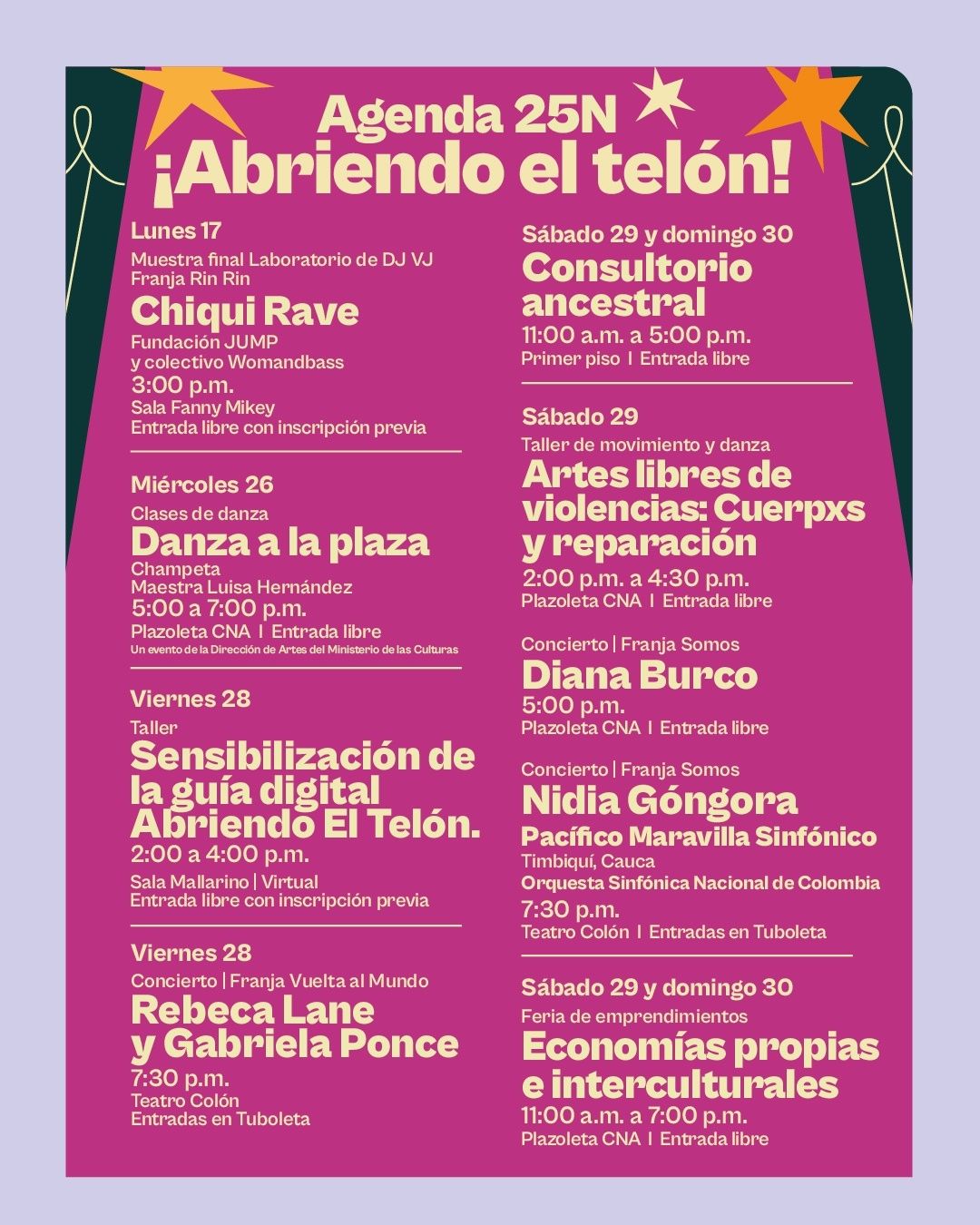 Además, habrá clases de danza con Danza a la Plaza que será con entrada libre; se ofrecerá un taller de movimiento y danza, Artes libres de violencias: Cuerpxs y reparación y el taller híbrido (presencial y virtual) de Sensibilización sobre la guía digital ¡Abriendo el telón!, acompañado de la Secretaría Distrital de la Mujer donde se expondrán metodologías para la prevención del feminicidio. Este último se realizará el viernes 28 de noviembre de 2:00 a 4:00 p.m. en la Sala Mallarino del CNA. La entrada será libre, con inscripción previa.
