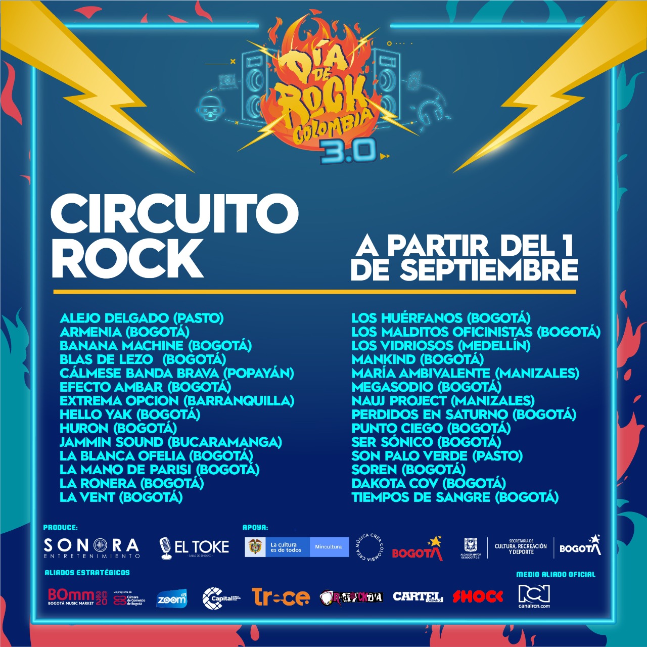 Ahora, la organización de Día de Rock Colombia, anunció 40 bandas que participarán del Circuito Rock y del cartel del festival, las cuales fueron seleccionadas de la convocatoria directa y de la alianza con el BOMM, en las cuales se presentaron 275 y 260 bandas respectivamente.