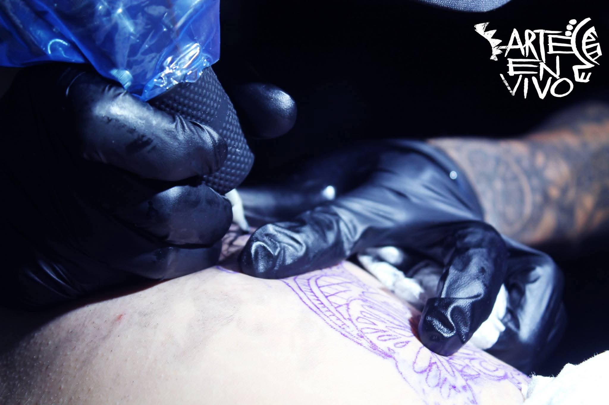 Sus dedos pulgar e índice aprietan el grip; el anular y el meñique sirven de trípode para su máquina tatuadora. Es una flor bastante grande la que está dibujando sobre el muslo izquierdo de la chica que ha confiado en él. Cuervo demuestra su talento en una convención celebrada en Cesar.