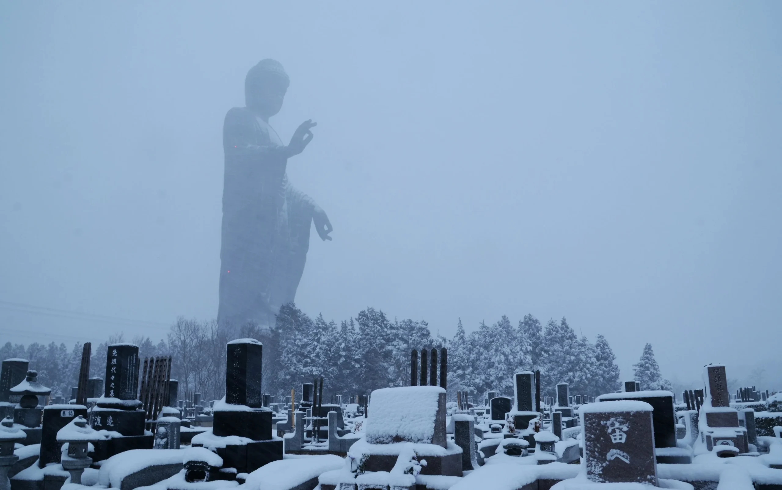A su alrededor todo parece insignificante. Casas, árboles, vehículos y personas podrían ser piezas de un diorama extendido sobre la llanura de Ibaraki, en la región de Kantō, al noreste de Tokio. Con 120 metros de altura, el Ushiku Daibutsu domina el paisaje. Desde la distancia, es un gigante cubierto por la bruma; de cerca, el bronce revela pliegues marcados y una superficie preparada para resistir el clima. Es la representación de Amitābha, figura central del budismo de la Tierra Pura, que saluda a los turistas con la mano derecha levantada. No necesita moverse para condicionar la forma en que se observa el entorno.