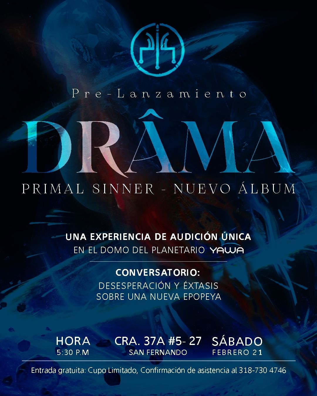 El próximo 21 de febrero, Primal Sinner presentará su nuevo álbum ‘Drâma’ en una sesión especial de escucha en el domo del Planetario Yawa, en Cali. La actividad, con entrada libre y aforo limitado, marcará el primer acercamiento público a la segunda placa discográfica de la agrupación.