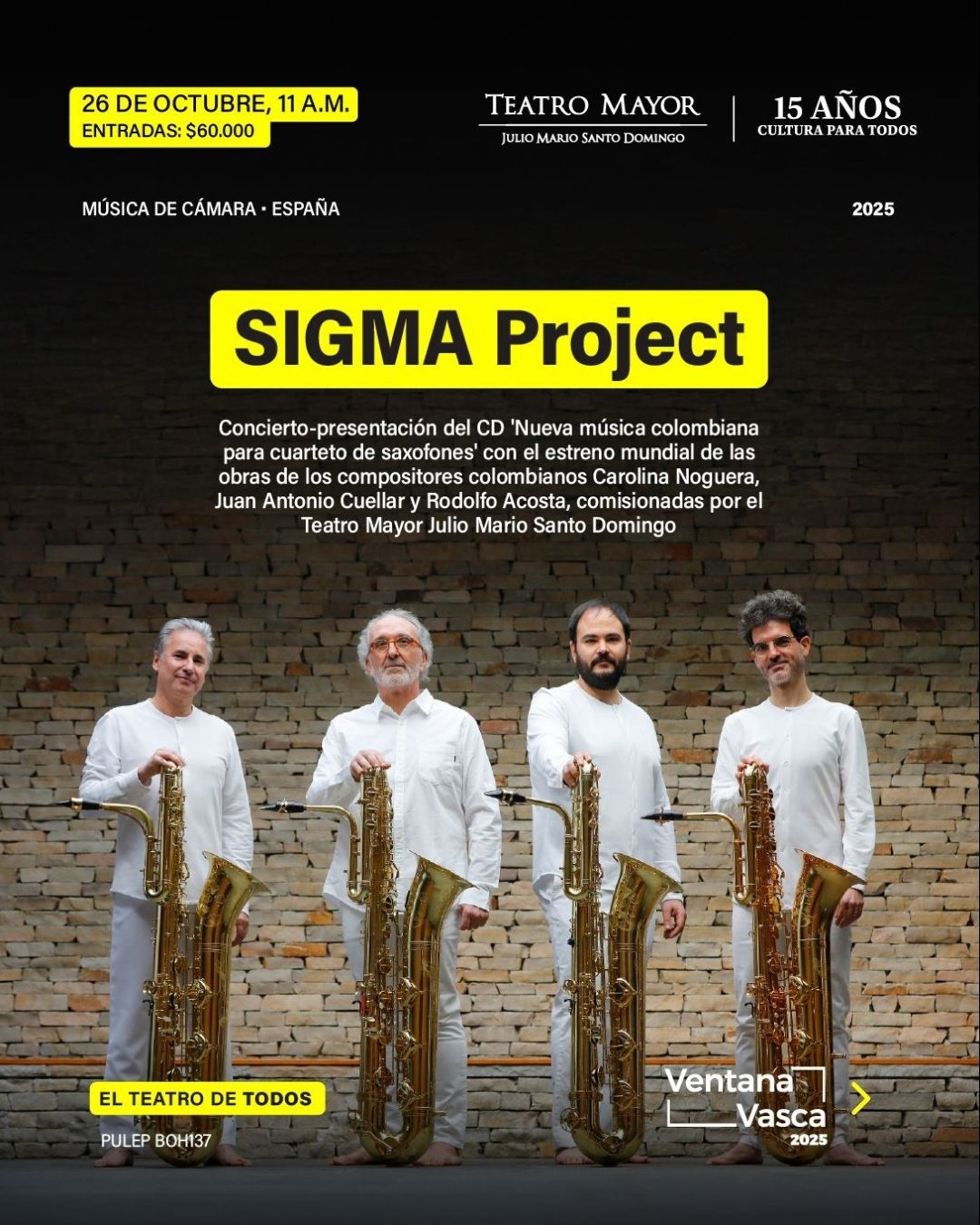 La agrupación, integrada por Andrés Gomis, Ángel Soria, Alberto Chaves y Josetxo Silguero, vuelve a Bogotá después de presentarse en escenarios como el Teatro Colón de Buenos Aires, La Scala de Milán y el Palacio de Bellas Artes de México. Con dieciocho años de trayectoria y una discografía que alcanza catorce títulos, SIGMA Project se ha consolidado como uno de los principales laboratorios sonoros dedicados a la exploración del saxofón dentro del repertorio académico.