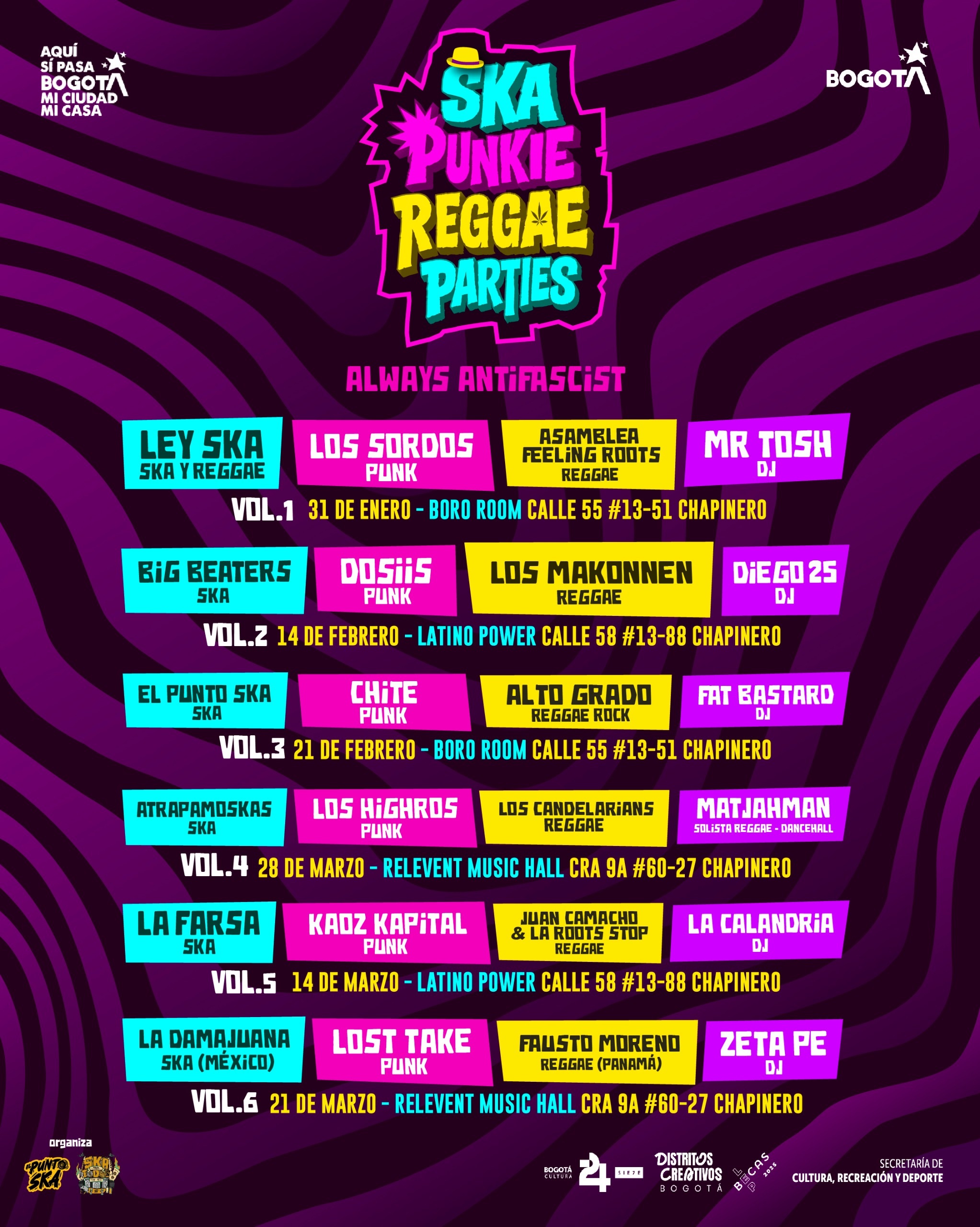 Con seis fechas, más de veinte proyectos en tarima, más de 100 artistas músicos en tarima y una apuesta clara por la circulación real e independiente, el Ska Punkie Reggae Parties 2026 se consolida como uno de los circuitos más importantes del primer semestre del año en Bogotá.