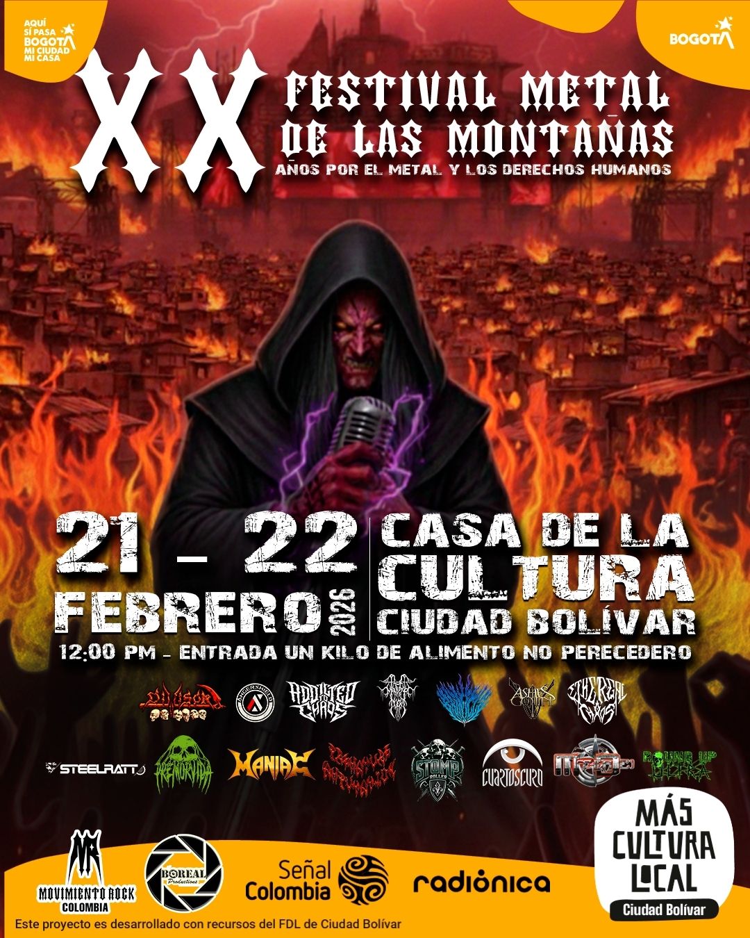 El XX Festival Metal de las Montañas celebrará sus 20 años los próximos 21 y 22 de febrero de 2026 en la Casa de la Cultura de Ciudad Bolívar, en Bogotá. El evento, de carácter gratuito y solidario, se ha consolidado como uno de los procesos musicales y comunitarios de mayor continuidad en la ciudad desde su creación en 2002.